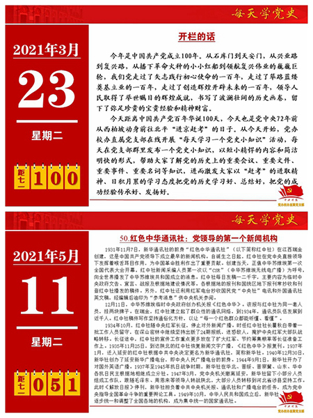 “谁最先提出了‘中国共产党’的名称?”“党徽图案是如何确定下来的?”“入党誓词中‘保守党的秘密’是如何确定的?”……从3月23日,距离中国共产党百年华诞100天这个特殊的日子开始,党办校办直属党支部就在支部群里发布“每天学习一个党史小知识”,截至5月11日,已推出了50期。这些“党史小知识”是党支部以《中国共产党简史》为主要参考来编辑整理的,以问答的形式呈现。党支部书记万伟伟表示,通过每天学习一个党史小知识,以短小精悍的内容和简洁明快的形式,帮助党员们了解党的历史上的重要会议、重要文件、重要事件、重要名词等,激发党员以日积月累的学习态度把党的历史学习好、总结好,把党的成功经验传承好、发扬好。