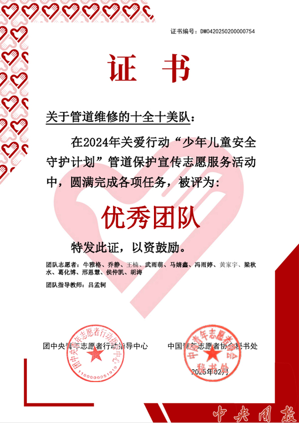据悉,由原研究生团总支和校团委推荐的一支研究生志愿服务队在2024年关爱行动“少年儿童安全守护计划”管道保护宣传志愿服务活动中获评“优秀团队”称号。